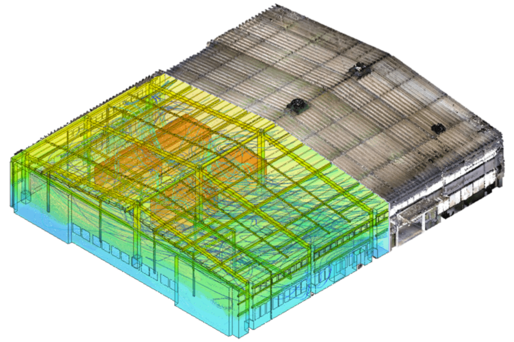 NavVis LXシリーズで既存建物を計測し、完全クラウドCAE「SIMSCALE」で温熱環境シミュレーションを行うことで、工場内の最適な換気方法や熱対策を定量的に検討できます。