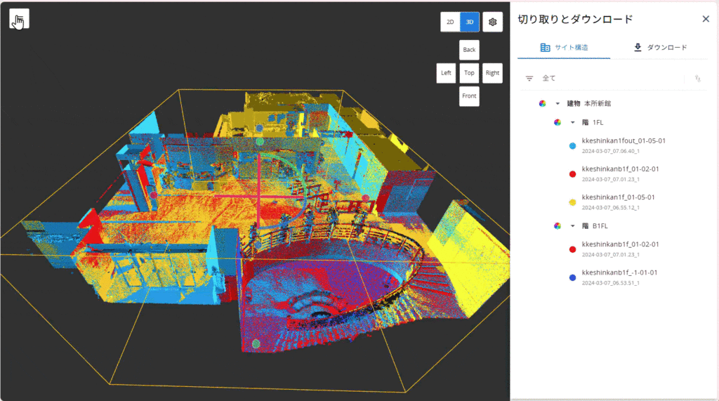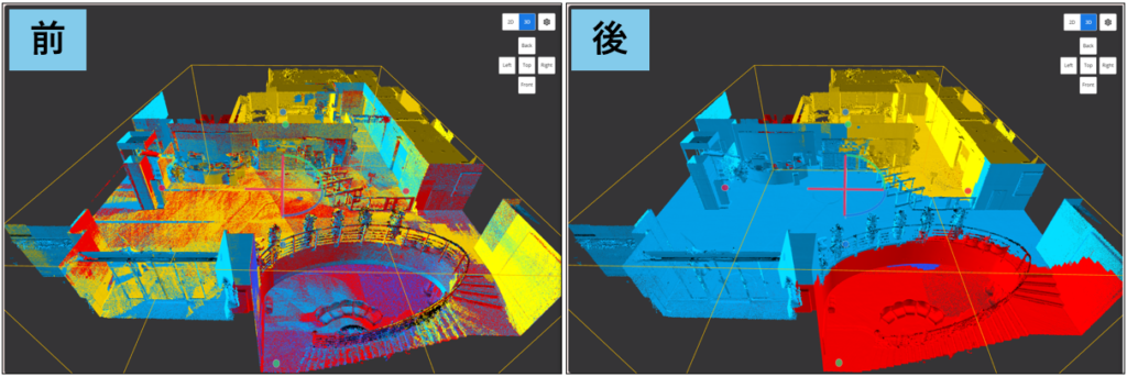 下記画像では、スキャン時にエリア分けしたデータセットごとに色分けされています。