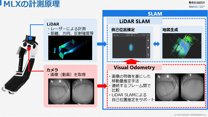 つまり、NavVis MLXの自己位置推定は「LiDAR SLAM(LiDAR)による自己位置推定」+「Visual Odometry(カメラ)による自己位置推定」により実現しています。