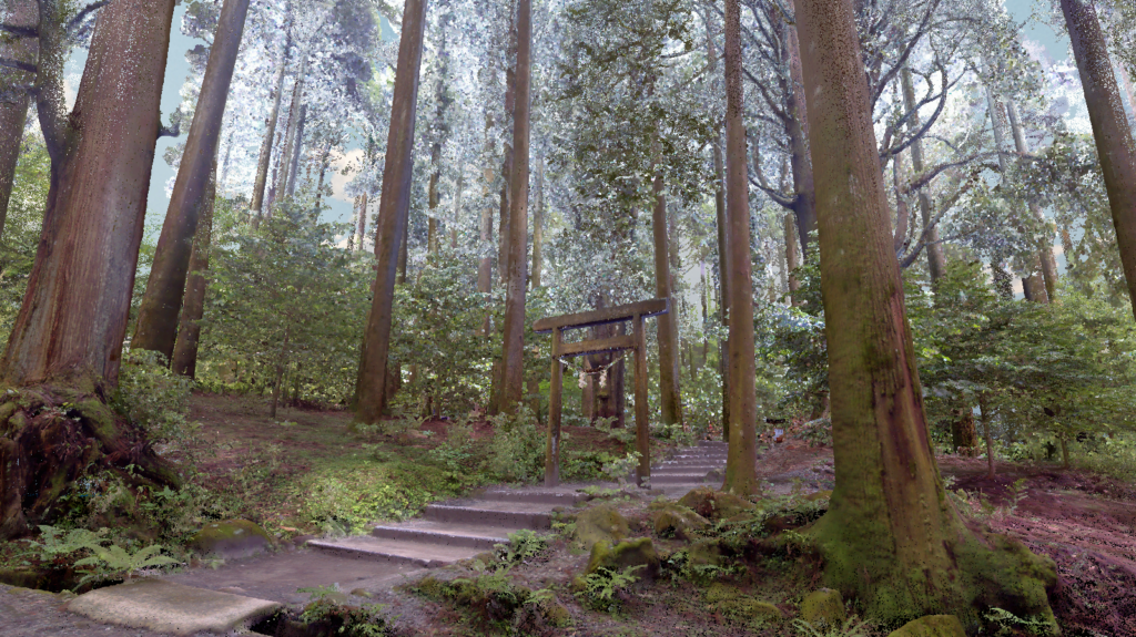 - 社寺仏閣:参道や林道に至る広大な敷地をVLXで計測し、TLSで計測した本殿の点群と組み合わせ、CGのような背景映像として3Dデータ化